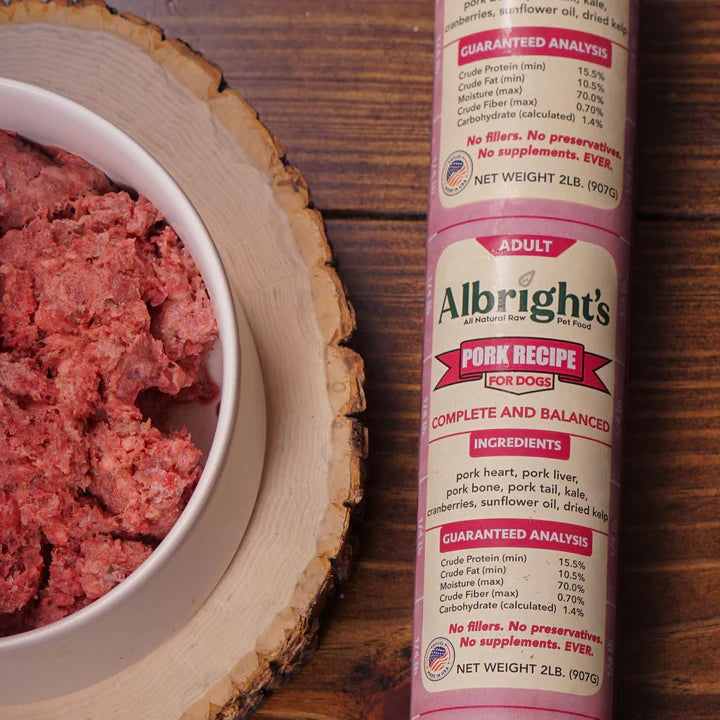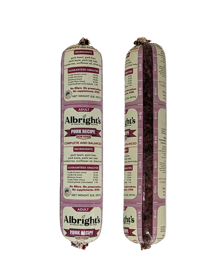 Albright’s Raw Dog Food is complete and balanced all-natural dog food that meets all nutritional requirements without adding soy, wheat, corn, rice, or artificial supplements. It has been developed to improve your pet’s health, appearance, performance, and digestion. Chicken with bone, chicken livers and whole egg are the first ingredients, then fresh kale, dried kelp, cranberries, and sunflower oil to add the minerals and vitamins that your dog needs. The eggshell adds calcium. Albright's All Natural Raw Dog Food contains no soy, wheat, corn, rice, oats, barley, or any other grain. It contains no potatoes, beans, peas, or any other filler. There are NO artificial ingredients or supplements or any animal by-product meal. It is complete and balanced dog food. Your dogs will love it! Albright’s Raw Dog Food is formulated and independently lab tested to meet the nutritional levels established by AAFCO (the American Association of Feed Control Officials). It is a complete and balanced food for all life stages, including the youth of large dogs (50 lbs or more as an adult.)