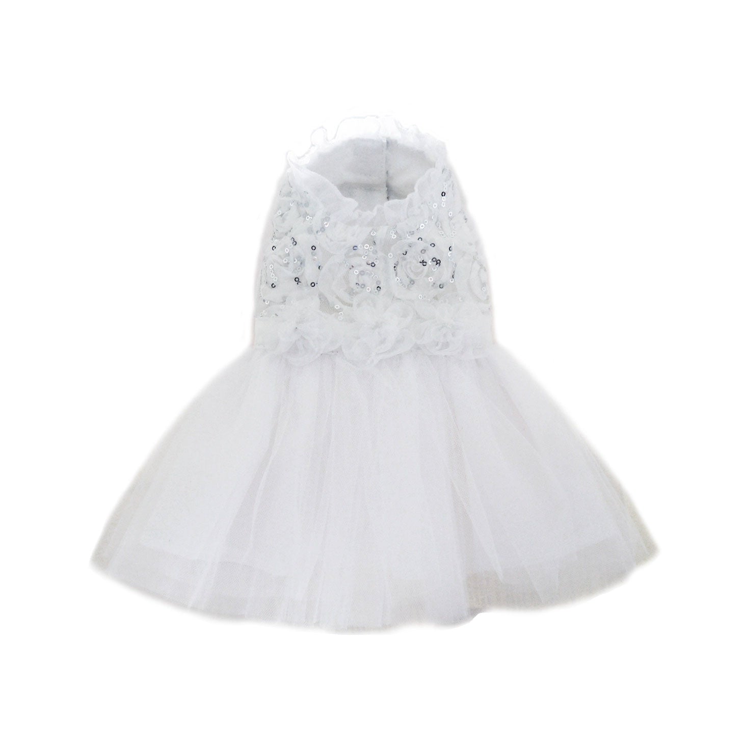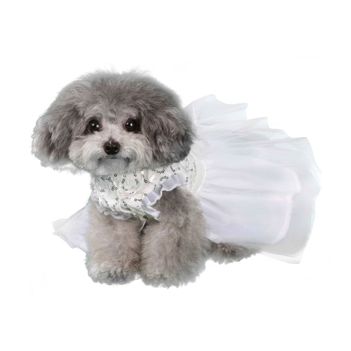 Fairy tale wedding dress with lace and sequin top, ruffles around neckline and sleeves, and layered tulle skirt. Waist embellished with beaded flowers. Comes with flower- decorated veil and hair clips.