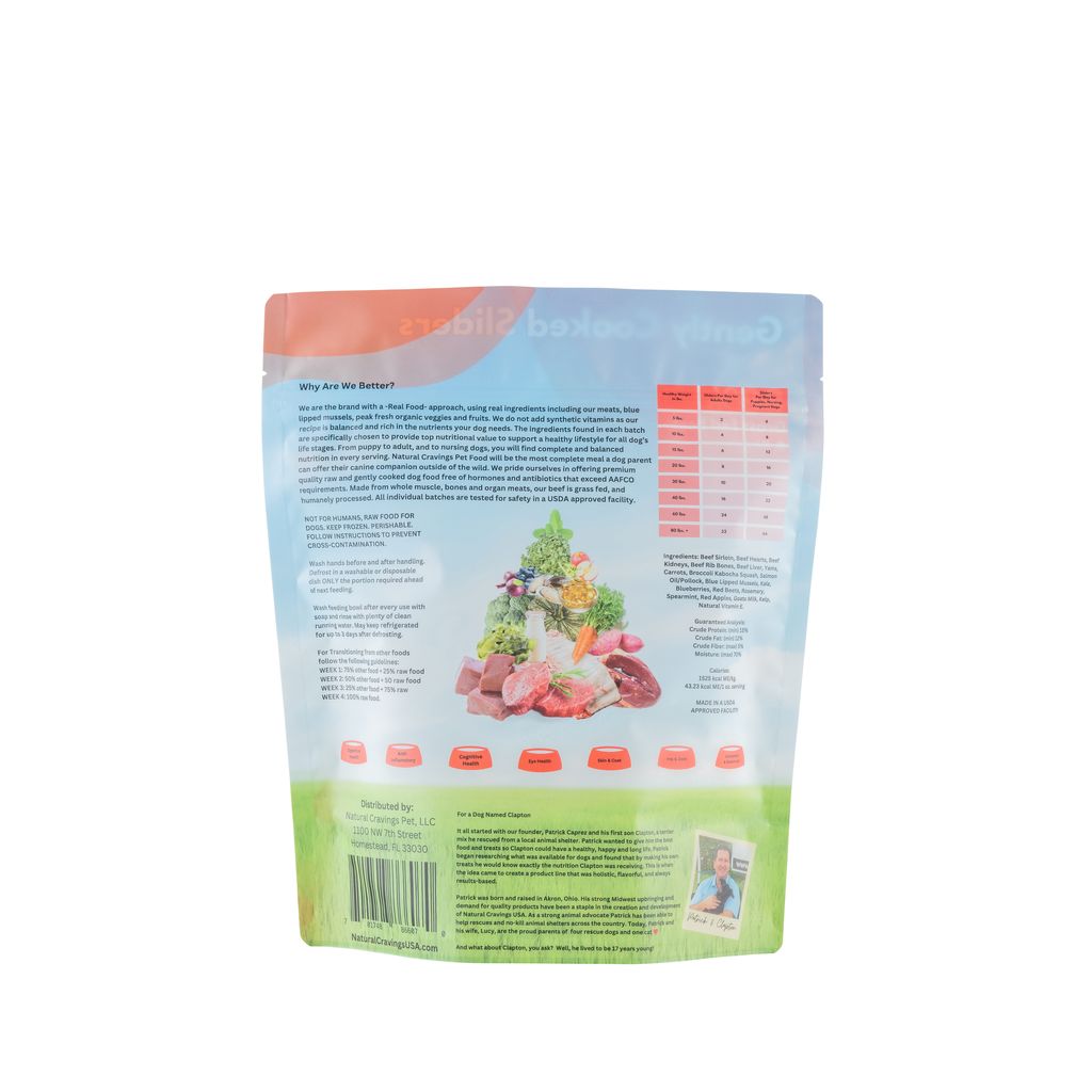 Beef Sirloin, Beef Hearts, Beef Kidneys, Beef Rib Bones, Beef Liver, Yams, Carrots, Broccoli Kabocha Squash, Salmon Oil/Pollock, Blue Lipped Mussels, Kale, Blueberries, Red Beets, Rosemary, Spearmint, Red Apples, Goats Milk, Kelp, Natural Vitamin E.