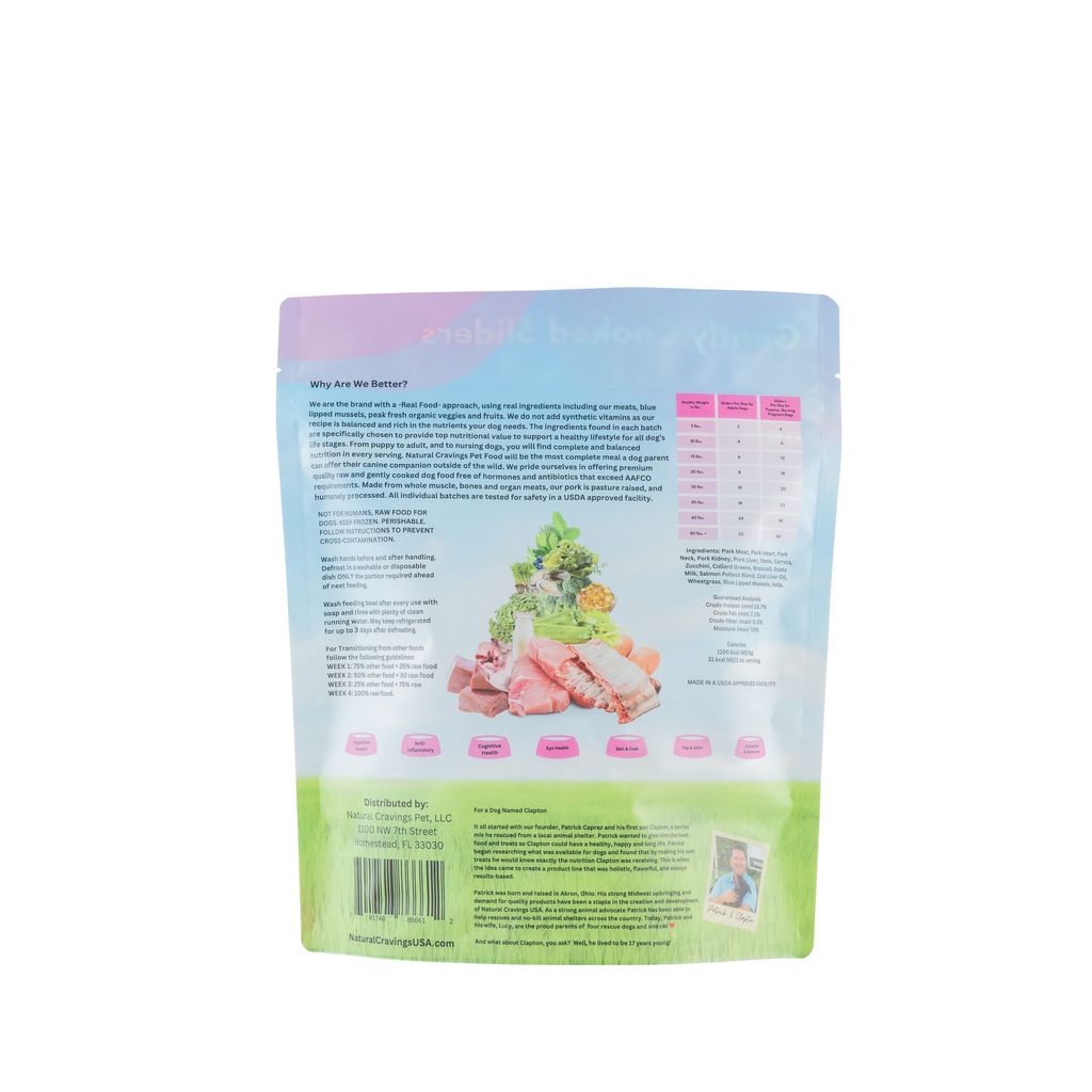 Pork Meat, Pork Heart, Pork Neck, Pork Kidney, Pork Liver, Yams, Carrots, Zucchini, Collard Greens, Broccoli, Goats Milk, Salmon Pollock Blend, Cod Liver Oil, Wheatgrass, Blue Lipped Mussels, Kelp.