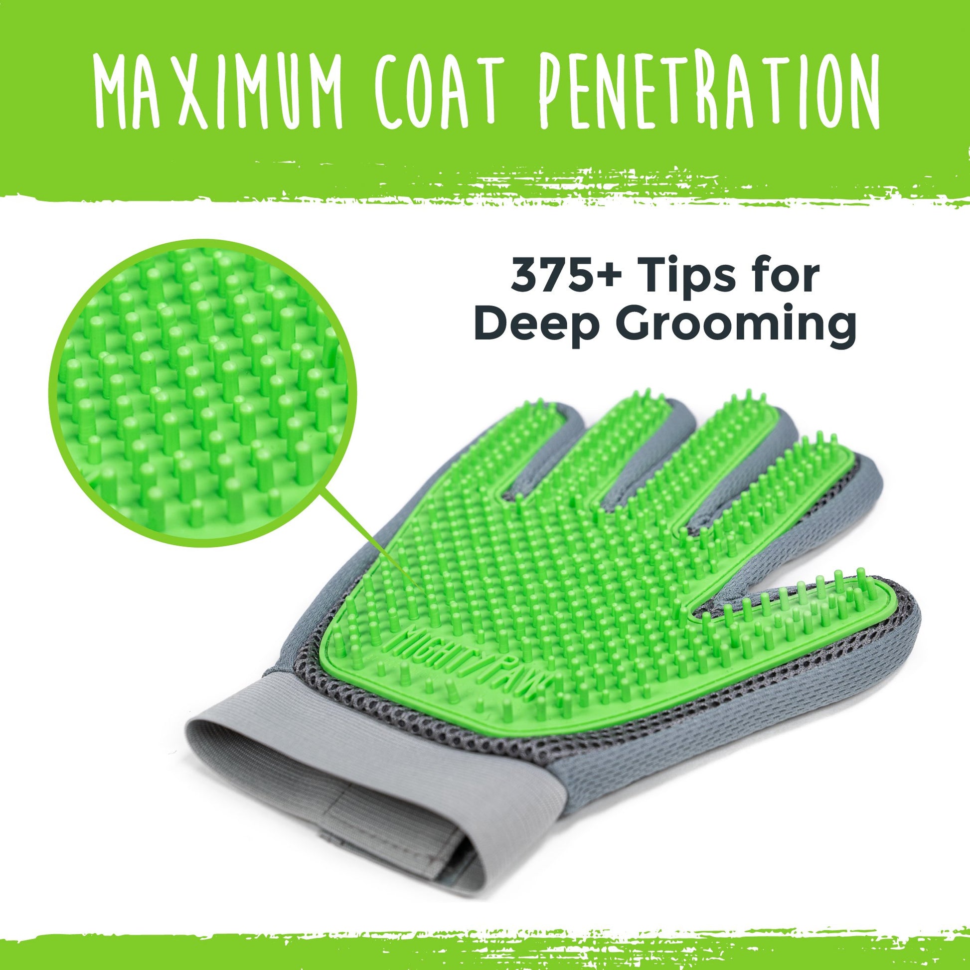 • Mighty Paw’s Dog Grooming Glove makes it a breeze to brush, de-shed, and massage your pets at home! That’s because it features 375+ soft grooming tips of different heights, maximizing coat penetration for pets with all hair types. It works great on dry AND wet coats!