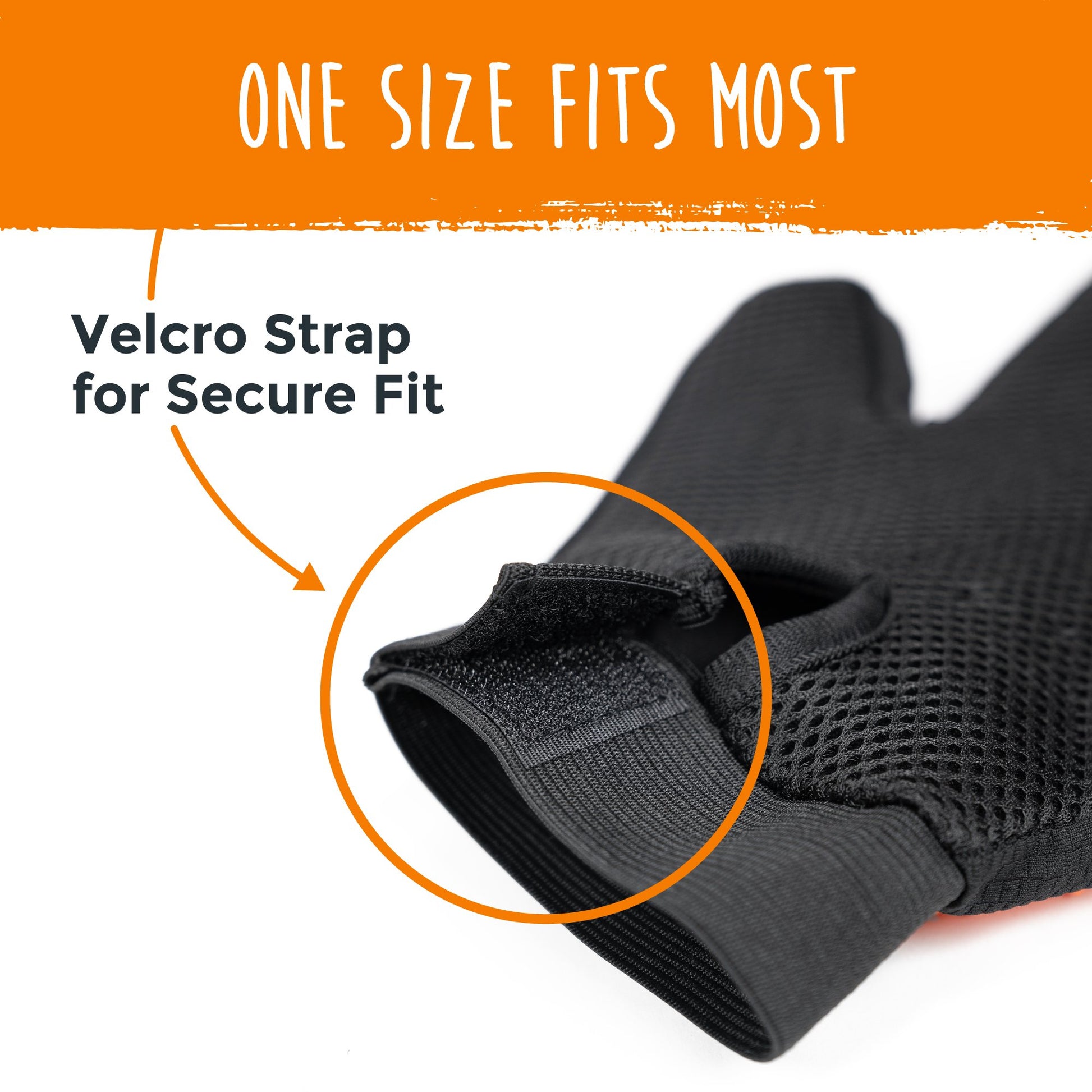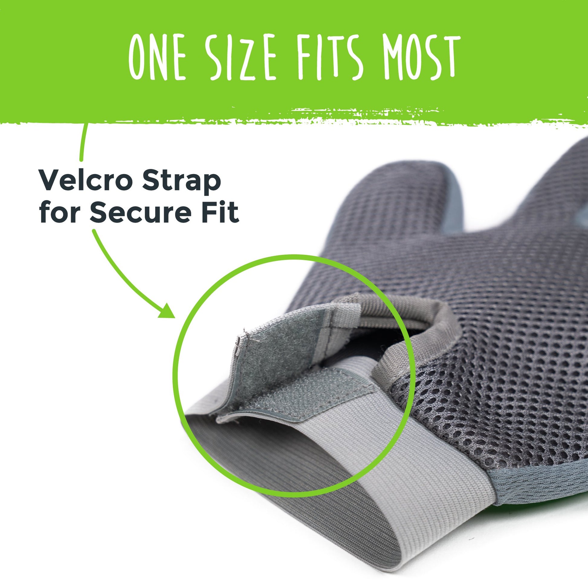 We designed our five-finger grooming glove to fit most right-handed people. We also added an adjustable velcro wrist strap for a secure fit every time you slip it on.