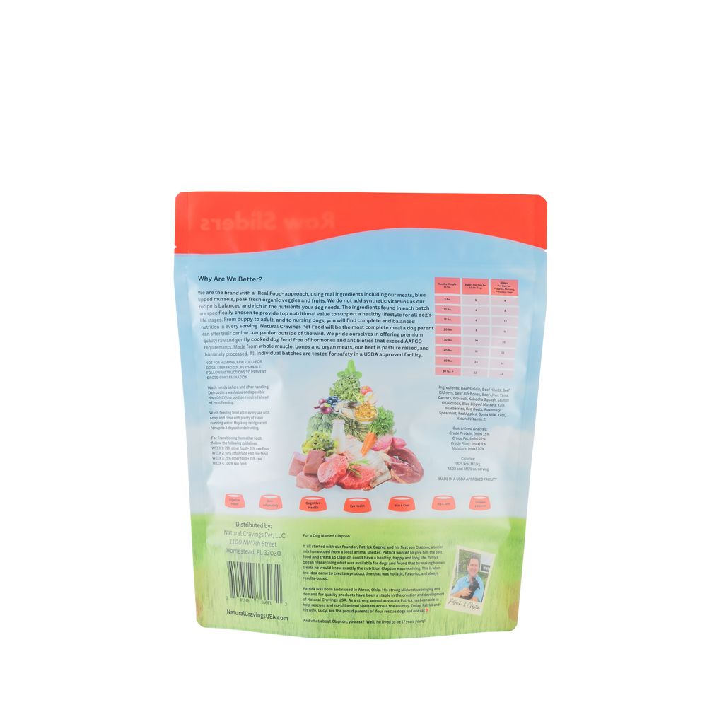 Beef Sirloin, Beef Hearts, Beef Kidneys, Beef Rib Bones, Beef Liver, Yams, Carrots, Broccoli, Kabocha Squash, Salmon Oil/Pollock, Blue Lipped Mussels, Kale, Blueberries, Red Beets, Rosemary, Spearmint, Red Apples, Goats Milk, Kelp, Natural Vitamin E.