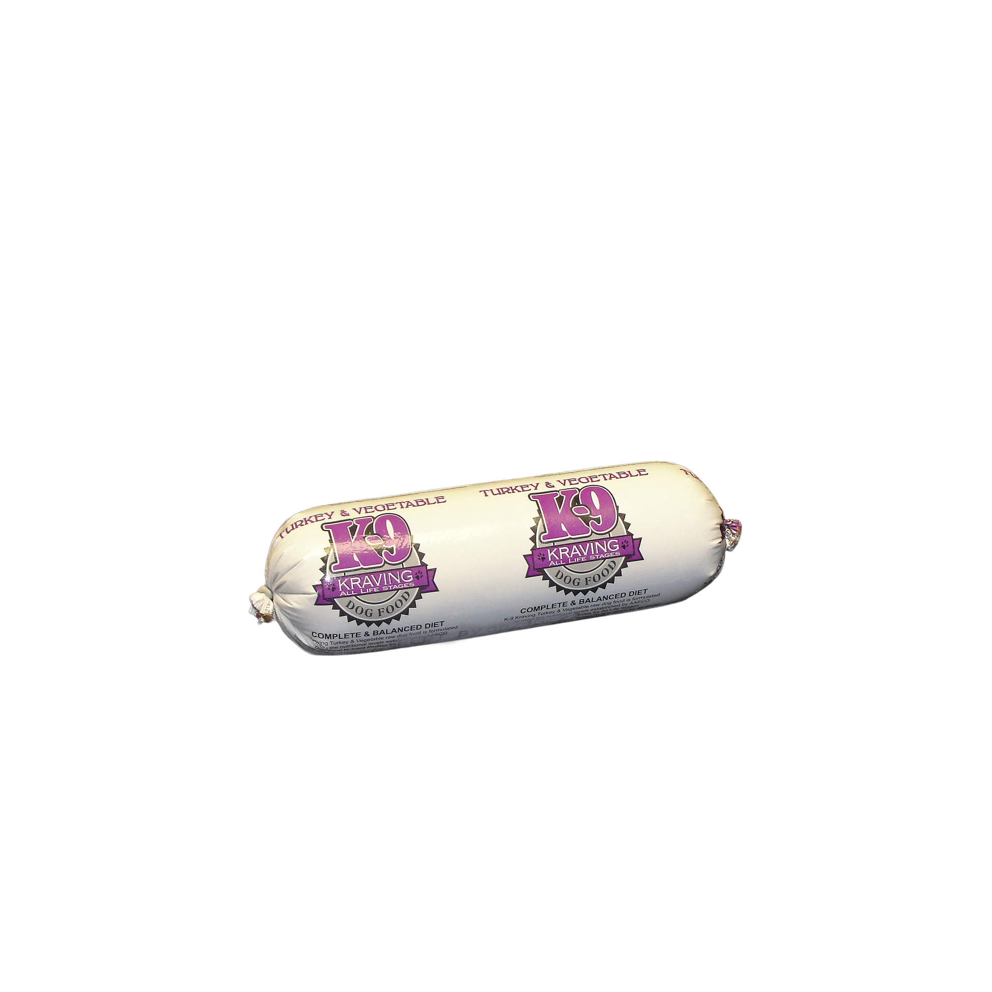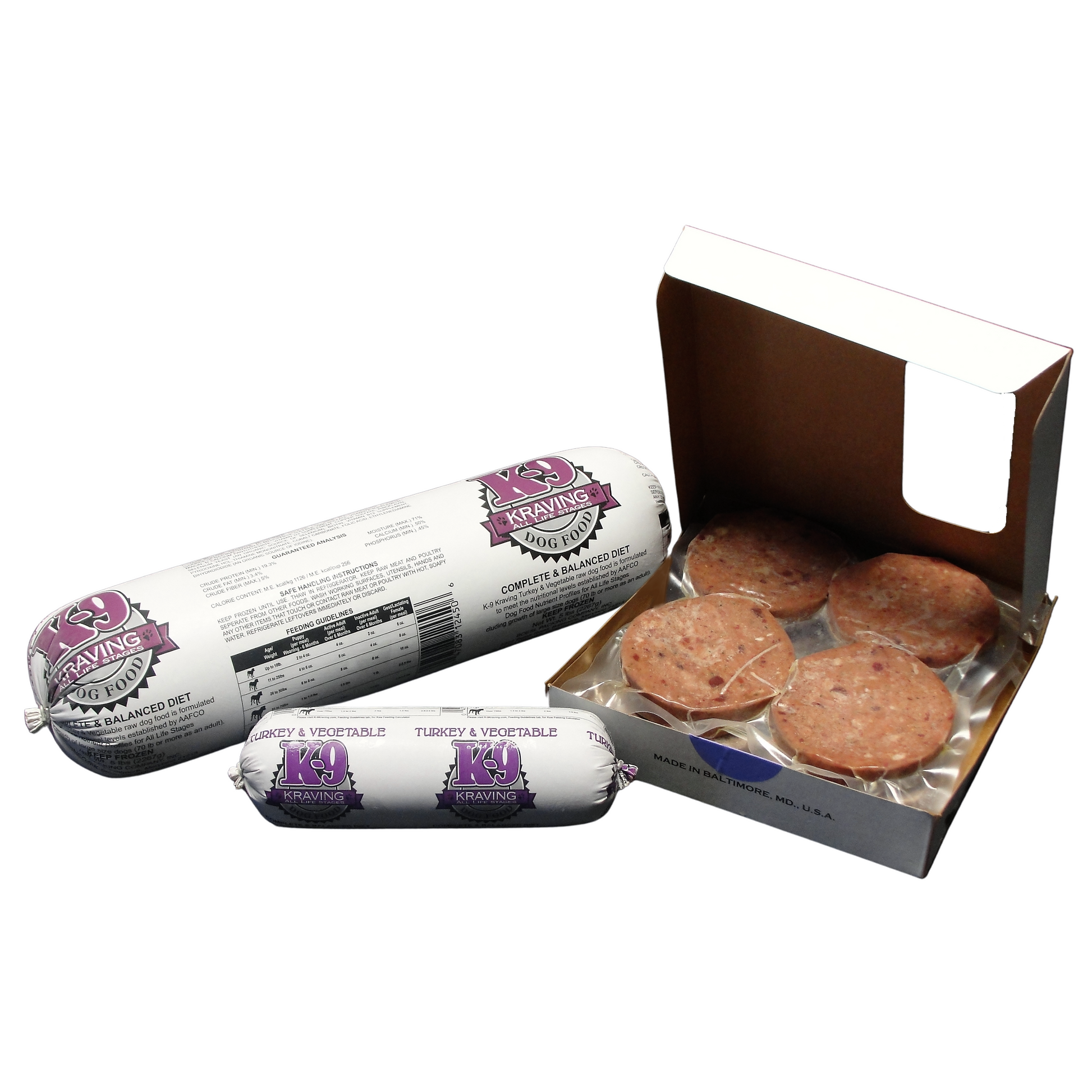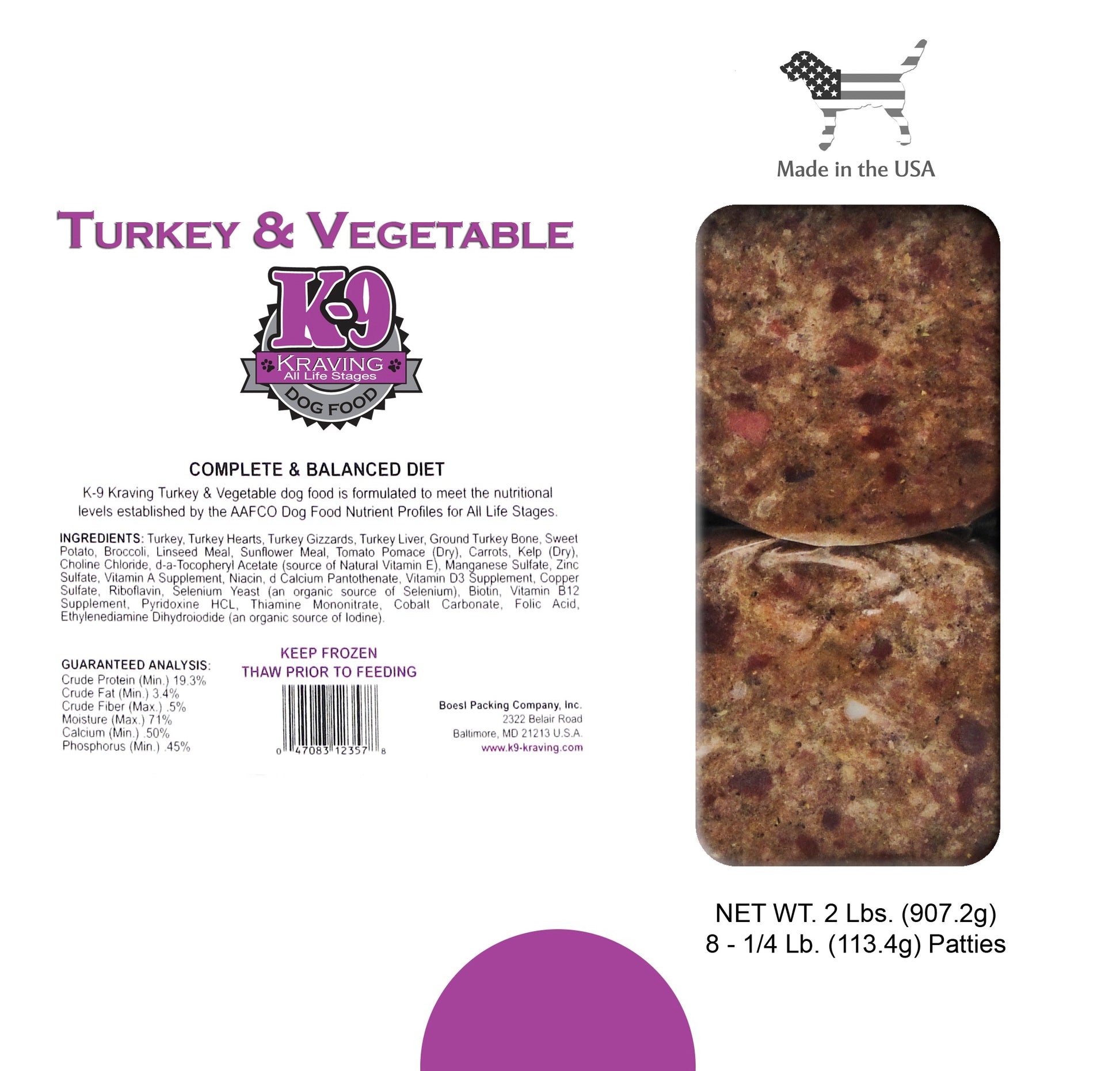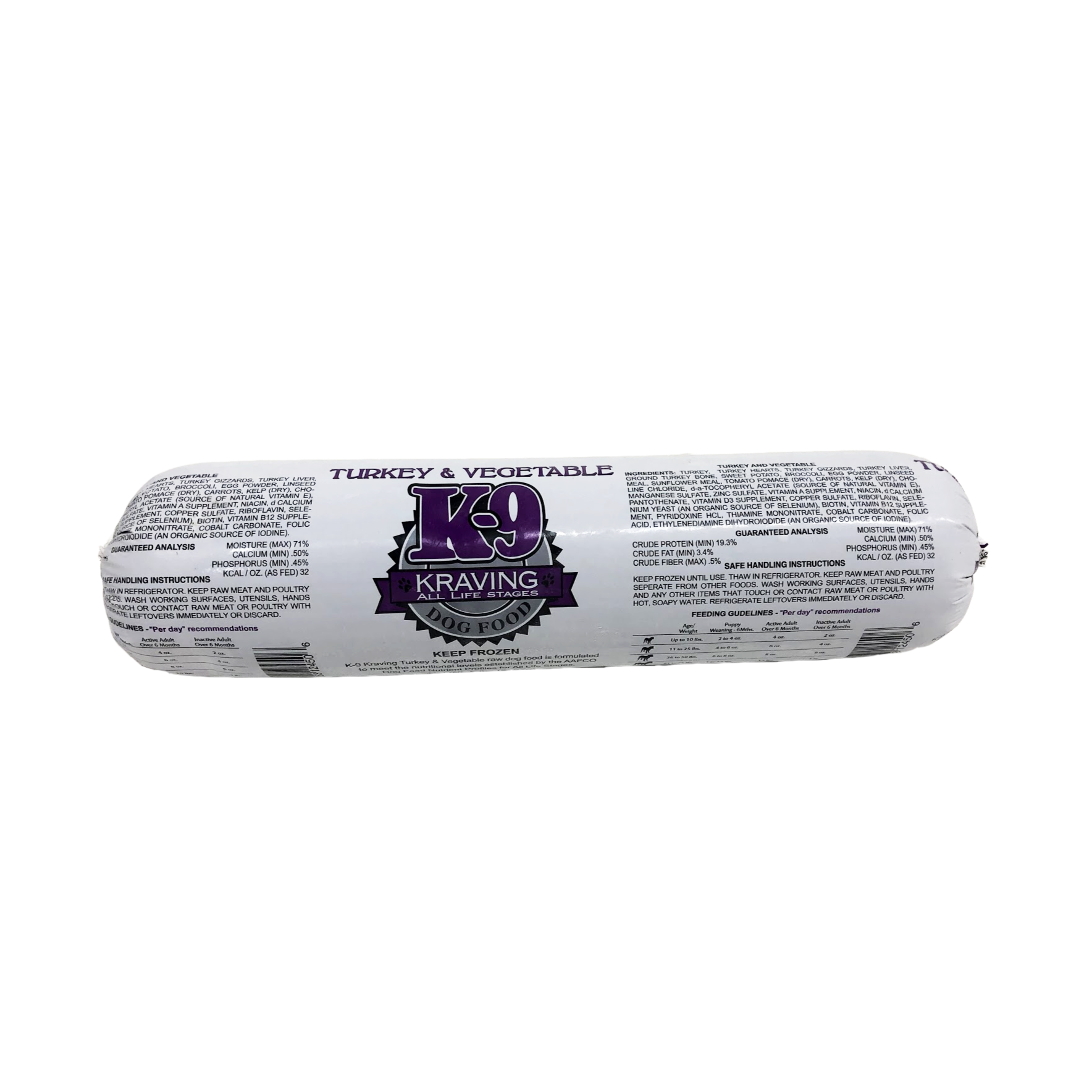 K-9 Kraving Turkey & Vegetable diet features  100% USA, Farm-Raised, USDA Inspected & Approved turkey trim and organ meat, along with fresh ground turkey bone and Farm-Fresh vegetables. The turkey we use is fed a vegetarian diet fortified with vitamins and minerals – a natural defense against bacterial organisms. It never receives antibiotics or growth promoters at any time. Animal by-products, fats, bakery or pet food products are never used in the poultry feed. Our turkey diet offers high, lean protein and a very low fat making this an exceptional choice for canines with gastro sensitivities, common protein sensitivities and/or dogs requiring weight management. Simply thaw & serve.