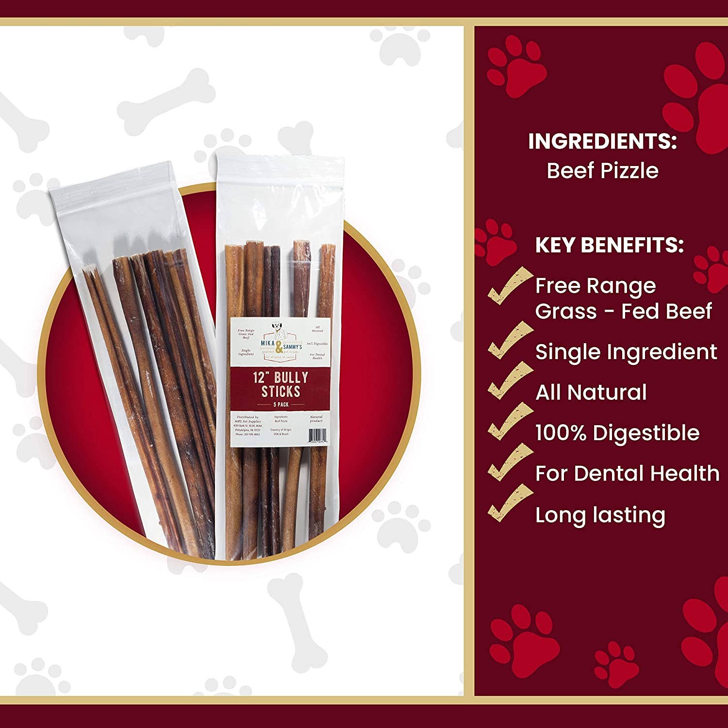 Mika & Sammy’s Bully Sticks are sourced from grass-fed, free-range cattle that are raised without hormones or antibiotics. Each bully stick is baked, handpicked, and inspected to ensure quality, texture and perfect consistency. Your pup will enjoy its delicious and fresh meaty flavor! A 100% single ingredient treat perfect for chewers.