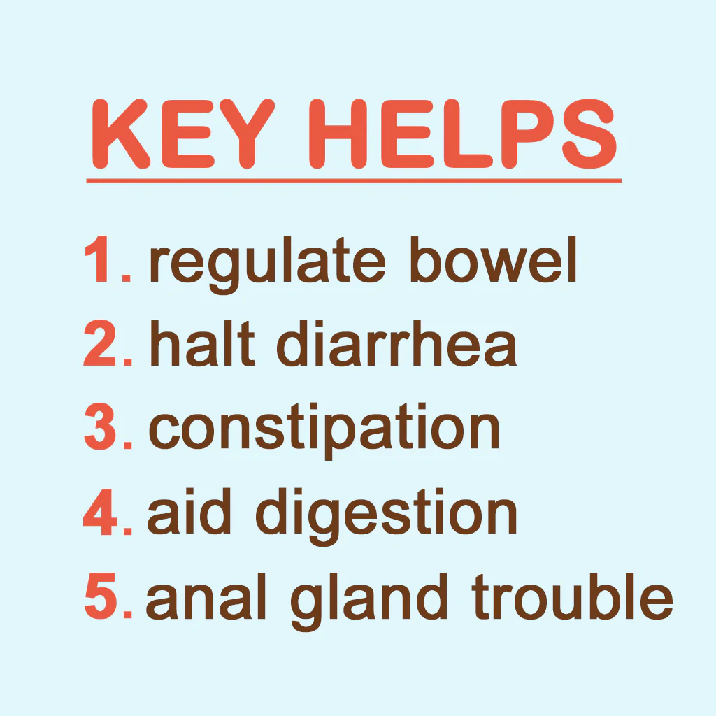 Easily digestible source of dietary fiber. Keeps bowels regulated. Good for diarrhea, constipation, anal gland troubles, digestive problems and more.