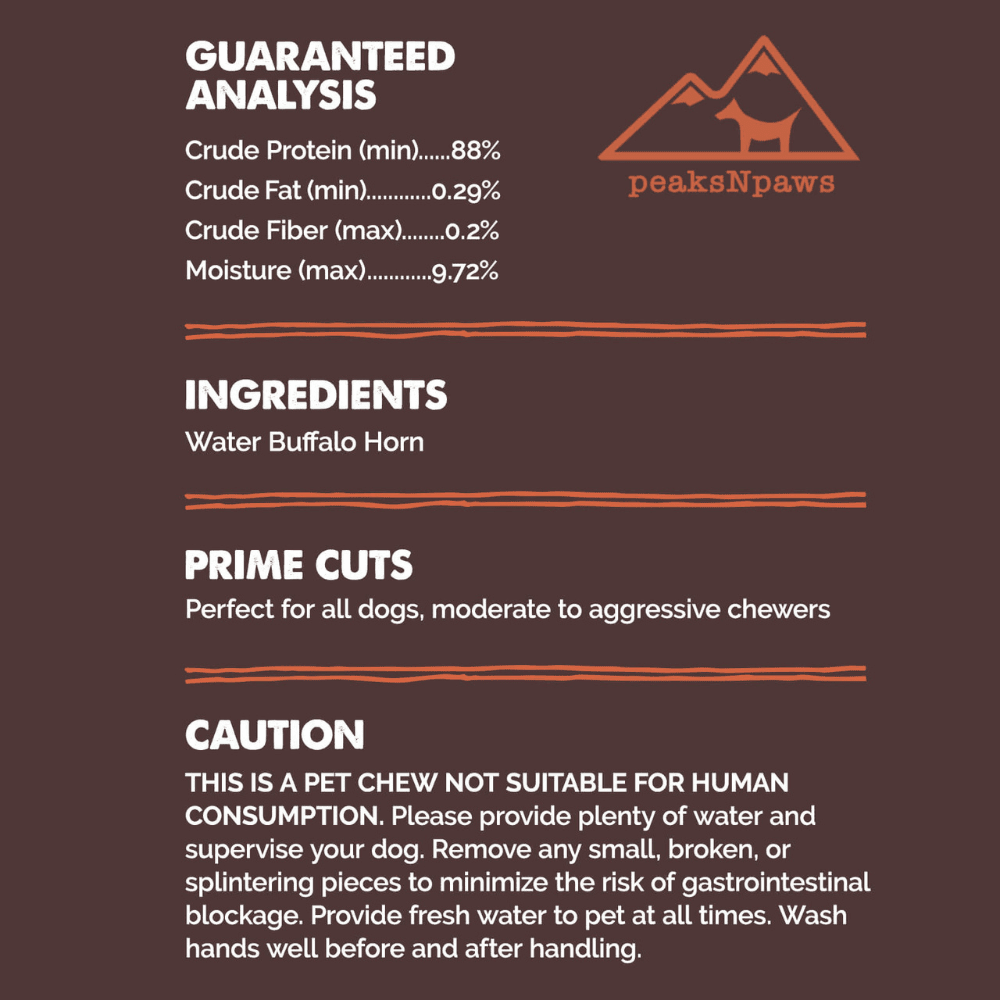 NUTRITION RICH:peaksNpaws Buffalo Horns are high in protein and low in fat. The bone core is covered by a resilient sheath made of keratin, rich in vitamins and minerals.They are also high in calcium and phosphorus, which are vital for healthy, strong bones and muscles. As a result, buffalo horns can be an excellent addition to your dog’s diet.