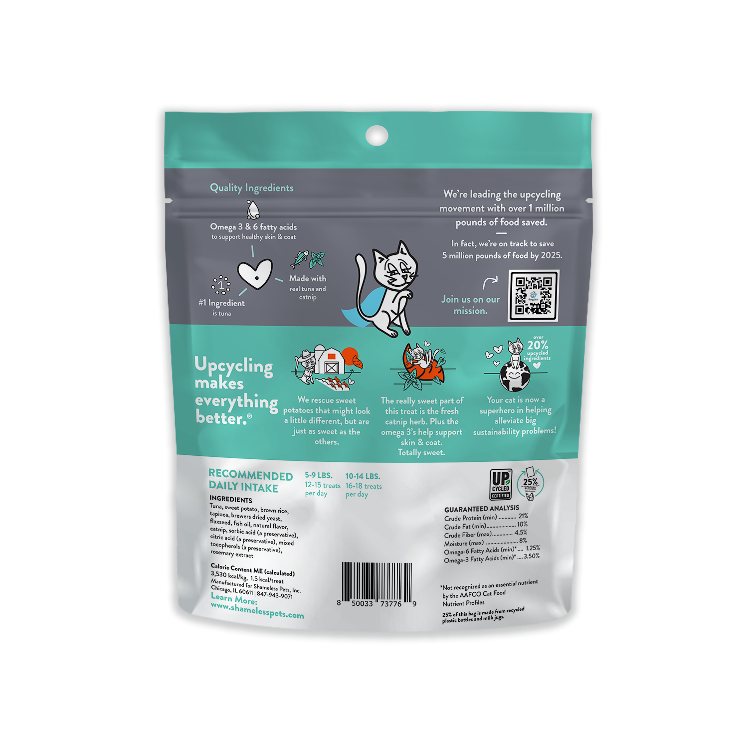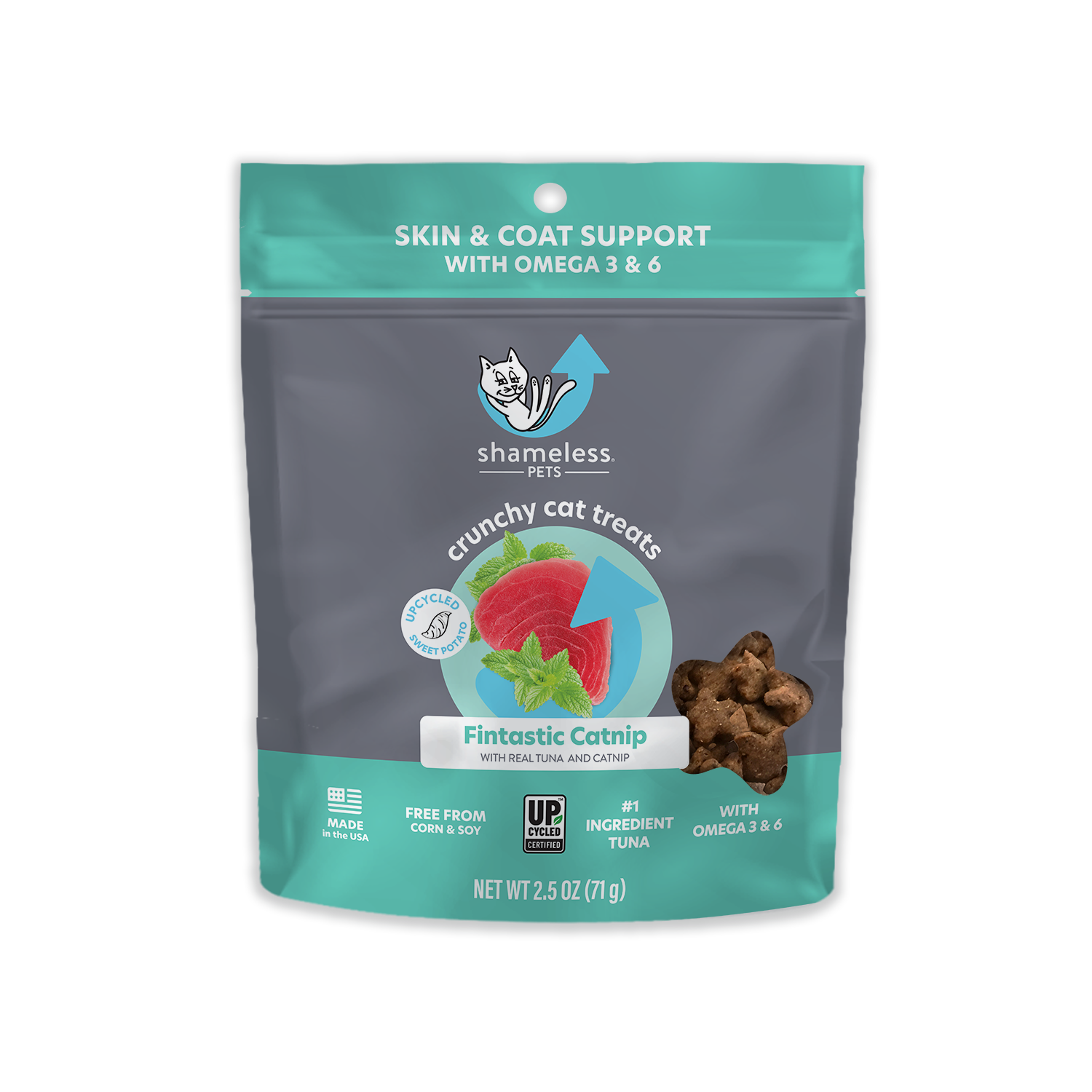 SHAMELESS PETS Fintastic Catnip Crunchy Cat Treats 2.5 oz Shameless Pets Fintastic Catnip Crunchy Cat Treats makes chillin' easier and tastier than ever before. These crunchy, star-shaped, bite-sized treats are made with tuna, and upcycled sweet potatoes, so your cat's getting a more sustainable treat. With added salmon fish oils for that extra skin & coat support, your cat will be lookin' good and feelin' good. Fast facts: Tuna is the first ingredient Made with upcycled sweet potato Digestion Support Low-Calorie Corn & Soy free No artificial flavors Proudly made in the USA Made using solar energy Bag comprised of 25% PCR Ingredients: Tuna, sweet potato*, brown rice, tapioca, brewers dried yeast, flaxseed, fish oil, natural flavor, catnip, sorbic acid (a preservative), citric acid (a preservative), mixed tocopherols (a preservative), rosemary extract. * Upcycled Ingredient