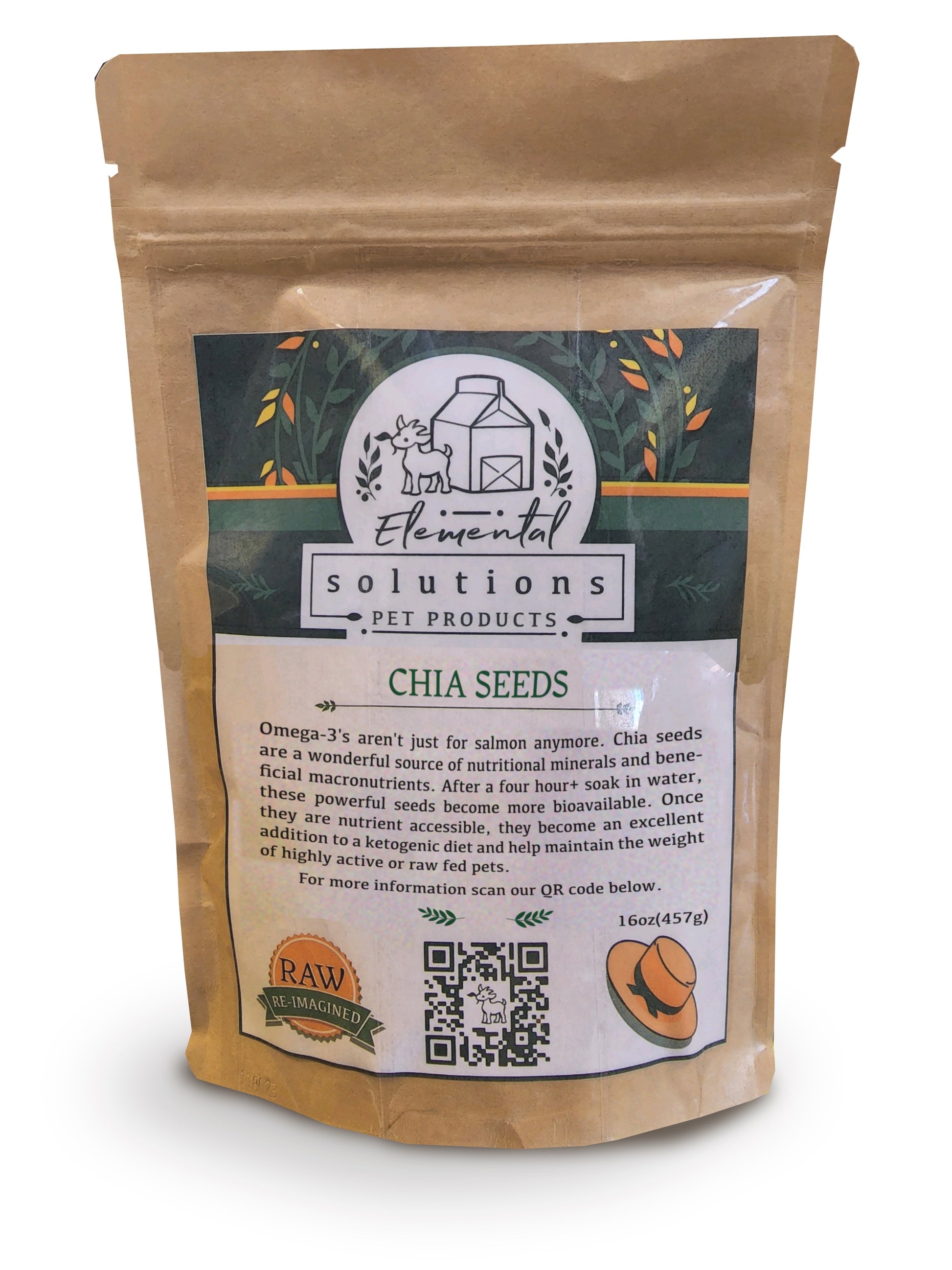 Chia Seeds are high in Omega 3 Fatty Acids, Phosphorus, Calcium and Manganese.  They are commonly used as a part of a Ketogenic Diet. They are also great for putting weight onto pets that otherwise don’t hold weight well (see directions)