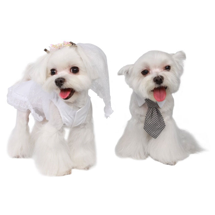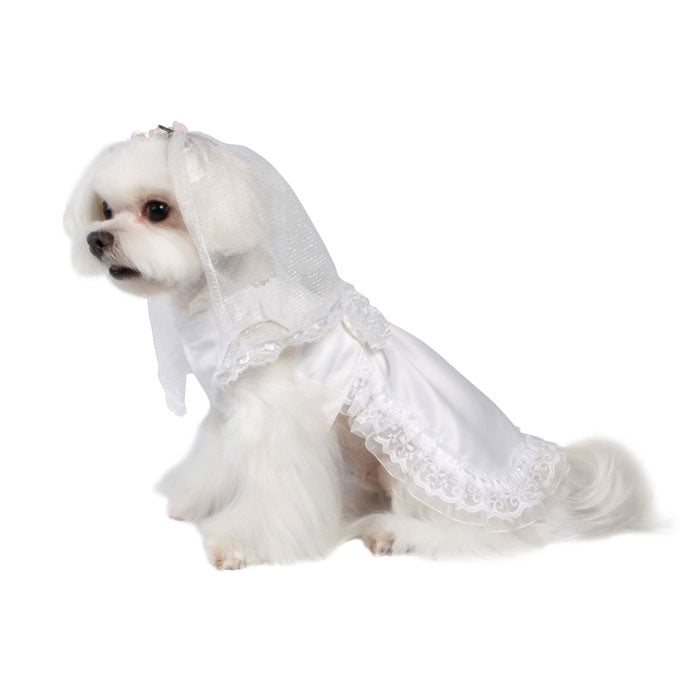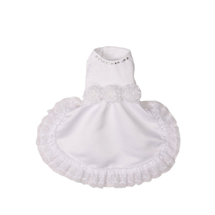 Fairytale wedding dress lined with rhinestones and faux-pearls along the neckline. Waistline embellished with bold flowers. Skirt trimmed with lace and layered with tulle. Comes with flower- decorated veil and hair clips.